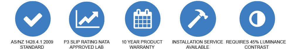 Tactile Systems Australia products have been independently tested for slip resistance. Please contact us for a copy of the report. This product features a P3 slip resistance rating – as tested by a NATA Approved Laboratory.
