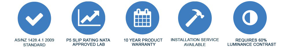 Tactile Systems Australia products have been independently tested for slip resistance. Please contact us for a copy of the report. This product features a P5 slip resistance rating – as tested by a NATA Approved Laboratory.