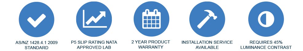 Suitable substrates for both the Warning and Directional TGSI include: Concrete (broomed & exposed), Bitumen, Timber, Vinyl, Carpet, Tiles & Pavers