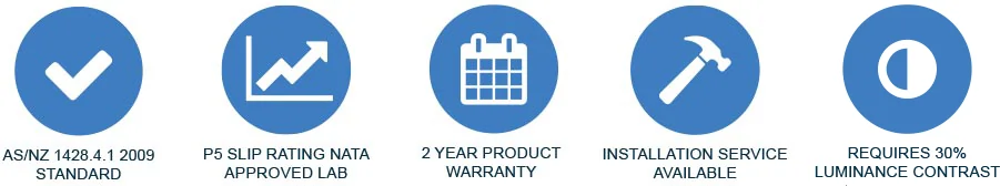 Warning Integrated Tactile Mat Polyurethane range are the ideal cost effective product for a wide range of applications. Available in a range of colours, they feature a P5 slip resistance rating – as tested by a NATA Approved Laboratory.